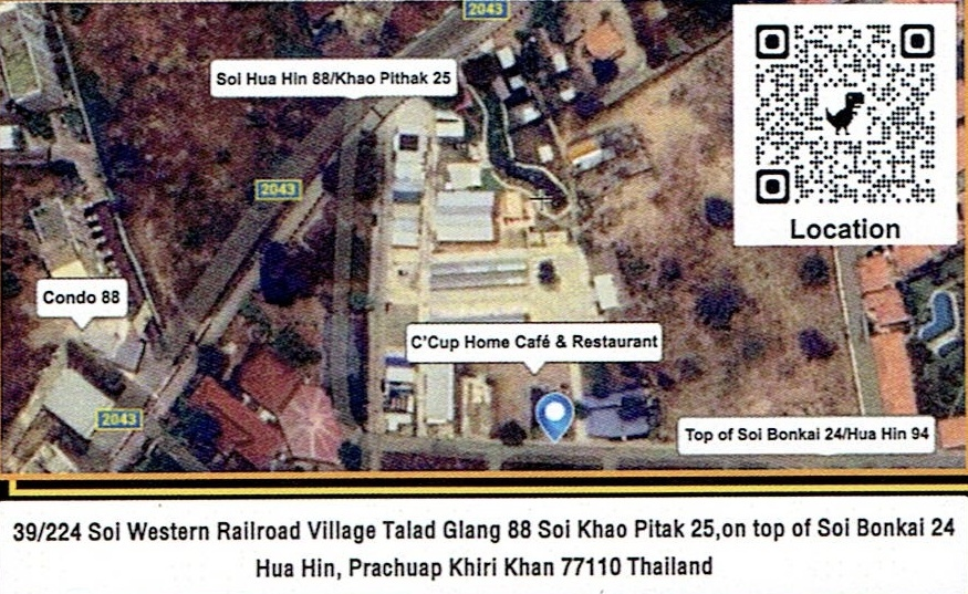 C’Cup Home Café & Restaurant is located on the South side of Talad Klang 88 market on Soi Hua Hin 88. The premise can be either conveniently reached through Soi Khao Pithak 25 of Soi Hua Hin 88 or by driving to the end of Soi BonKai 24 of Soi Hua Hin 94, right after the community of Norway Garden. With Hin Lek Fai mountain range to the North, C’Cup Home Café & Restaurant is a place where you will find indoor & outdoor seating and a green environment with ferns and other plants to cool you down. Plenty of parking for both cars and motorbikes is provided.